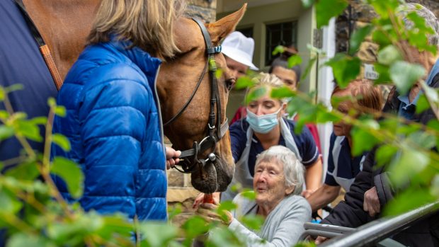 ‘Putting smiles on faces’: ‘incredible’ horse delights school and care home in special visit