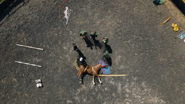 Barrel skid and roll, and ‘a touch of people power’, needed to rescue stuck horse