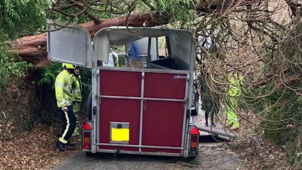 A ‘lucky escape’ for horses trapped in trailer stuck under fallen tree