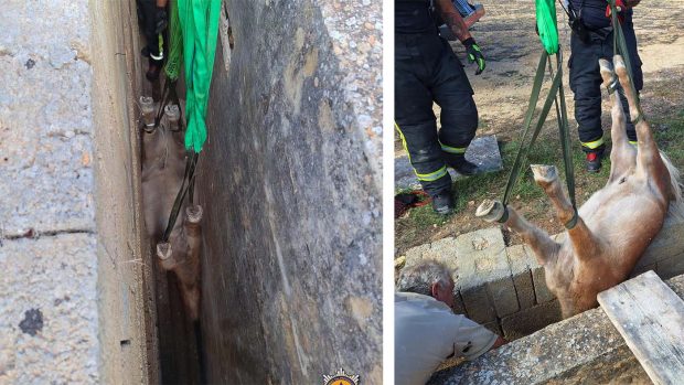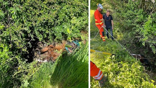 Casper the dressage horse spooked by cows falls into ditch eight feet deep