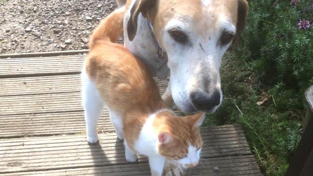 A foxhound and a cat have renewed the great friendship that started between them when the foxhound – Belvoir Polish 10 – was a puppy