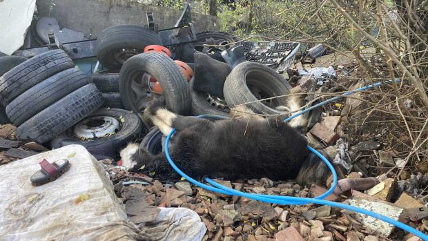Emaciated and injured foal found collapsed upside-down among tyres and rubble