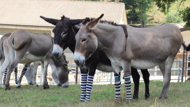 Socks appeal! Donkeys beat the flies with snazzy legwear